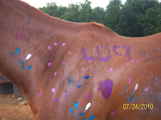 Lucy's two most favorite things in all the world are horses and art---combine the two and you have a match made in Heaven!! We knew on the itinerary it stated that there was "horse painting". We just were not sure what that meant and finally agreed that it must mean painting a horse on paper---NOPE---it was painting ON the horse. What a wonderful sport this horse was!!! She got a wonderful bath afterwards that I know had to feel great on such a hot day!!